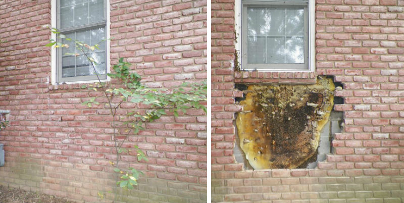 «Время от времени я получаю звонок, от которого чуть ли не съеживаюсь. Иногда это пчелы на большой высоте, а иногда пчелы, засевшие глубоко под кирпичами. Я предпочитаю действовать наименее агрессивно и не вторгаться в естественную среду, убирая пчел из зданий. Я не люблю разрушать кирпич. Вдруг они посыплются дальше и их нельзя будет восстановить? Однако в этом случае, несмотря на то, что я предпочитают не рушить облицовку дома, получившийся окончательный вид того стоил! А владелец дома был более чем рад, что нам удалось убрать и перевезти пчел вместе с улеем».