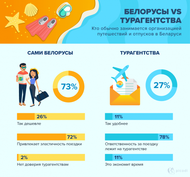 73% белорусов самостоятельно занимаются организацией путешествий и отпусков, в основном потому, что так дешевле и гораздо удобнее, ведь в таком случае план поездки можно безболезненно менять и перекраивать. Лишь очень немногие отметили, что не доверяют турфирмам.