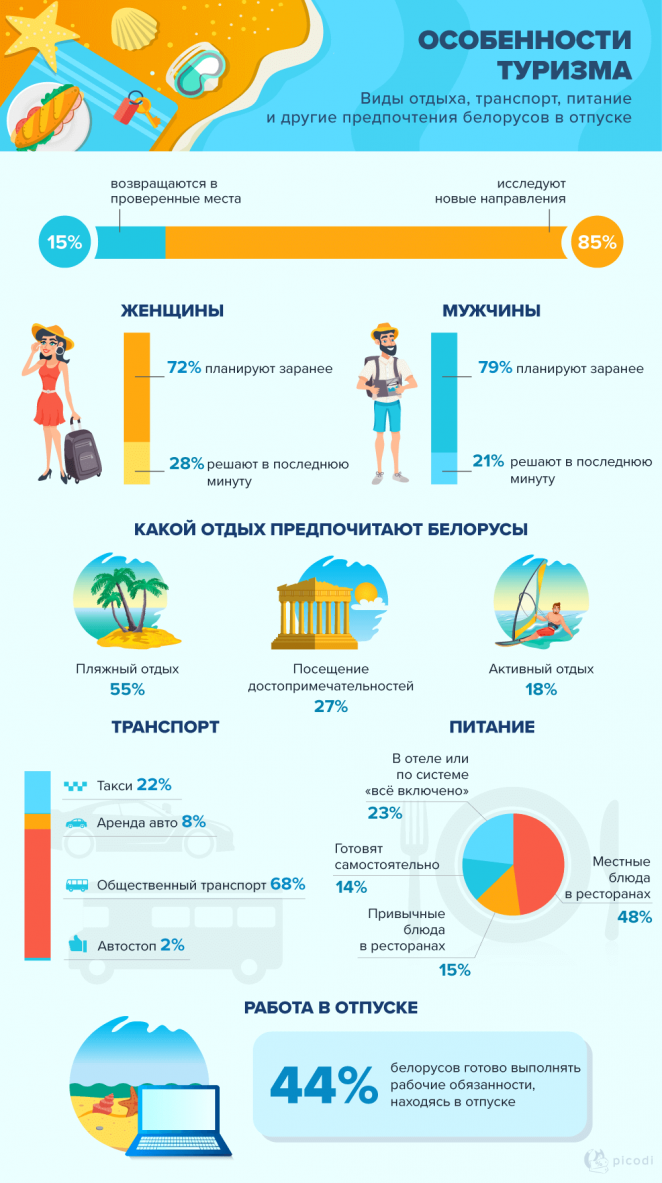В основном белорусы предпочитают исследовать новые для себя направления (85%) и только 15% опрошенных периодически возвращаются на отдых в проверенные места. По данным Picodi.com, планировать отдых заранее предпочитает больше мужчин, чем женщин. В последнюю минуту решение о поездке принимают 28% женщин и 21% мужчин. Львиная доля путешествующих белорусов (55%) предпочитают отдых на пляже, 27% делают ставку на посещение достопримечательностей, музеев и знаковых мест, а 18% выбирают активный отдых.