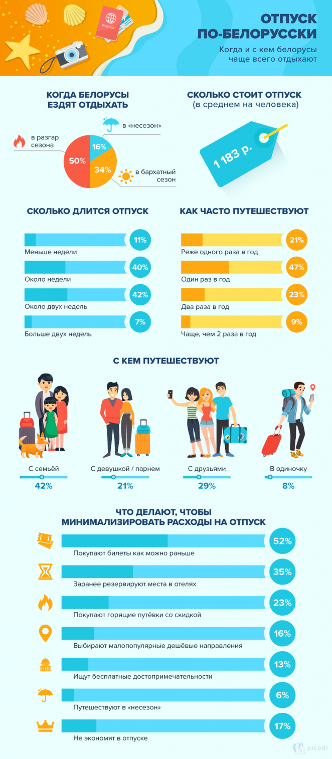 В среднем отпуск обходится белорусам почти в 1190 рублей на человека. При этом только 8% опрошенных путешествуют в одиночку, а 42% путешествуют с семьей. Наибольшим спросом пользуются поездки в разгар сезона (50%) или в бархатный сезон и межсезонье (34%), когда цены снижаются, наплыв туристов падает, но погодные и другие условия еще способствуют отличному отдыху.