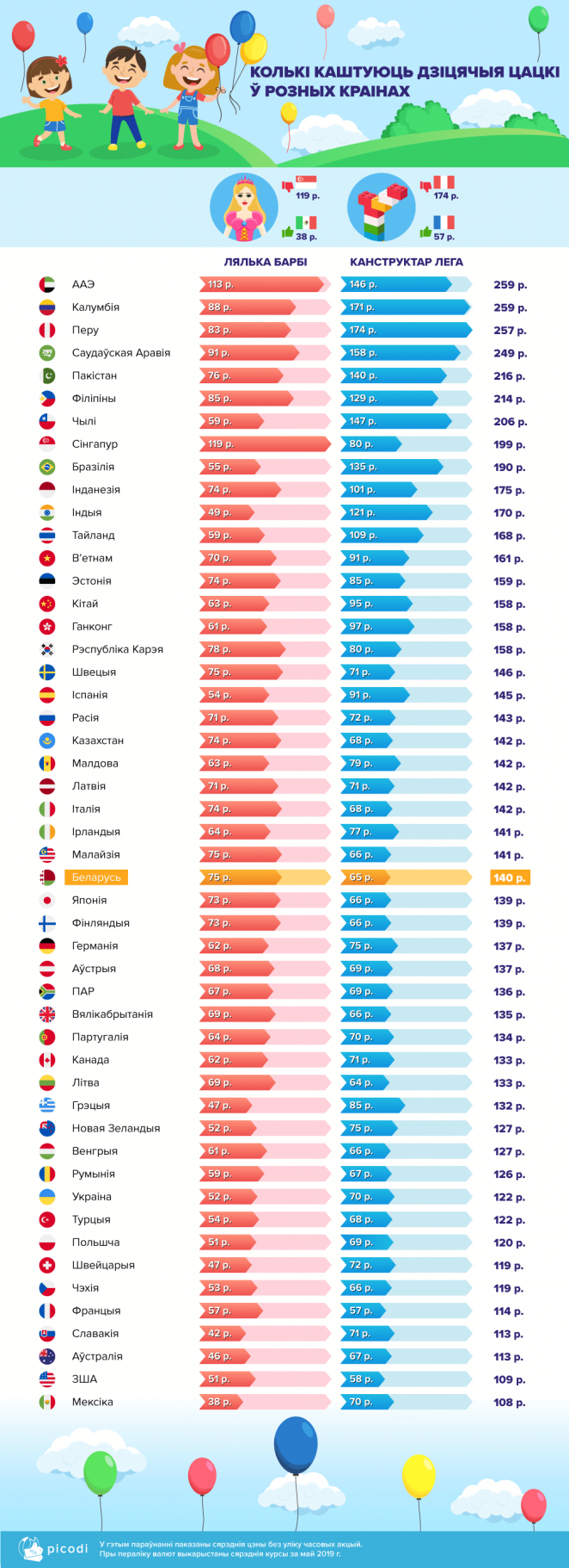 Команда аналитиков Picodi.com решила сравнить среднюю стоимость популярной куклы и набора кубиков в более ста магазинах по всему миру. На инфографике показано, в каких странах мира белорусским родителям пришлось бы серьёзно перекраивать семейный бюджет, чтобы приобрести столь желанный ребёнком подарок.