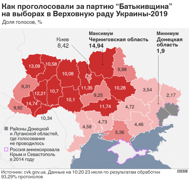 С другой стороны, "Батькивщина" не преодолела символический пятипроцентный барьер ни в одной из областей юго-востока, за исключением Херсонской, где она набрала 5,4% голосов. В Донецкой и Луганской областях "Батькивщина" взяла около 2% голосов и финишировала на шестом месте.