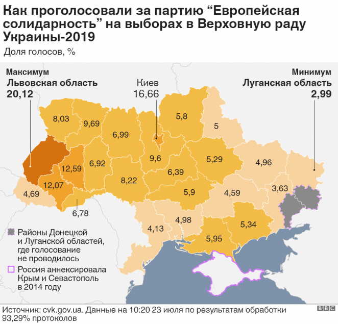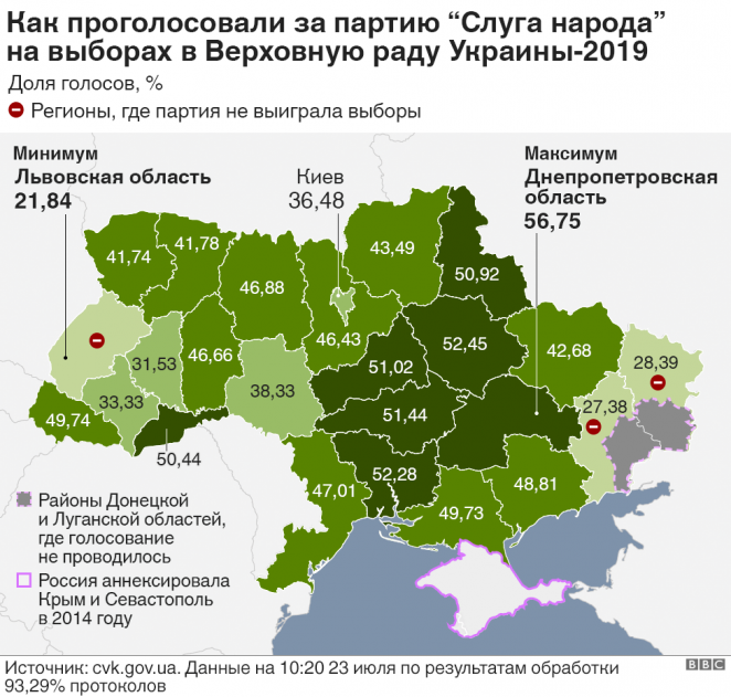 Партия Зеленского заняла первое место во всех областях Украины, кроме Донецкой и Луганской, где победила "Оппозиционная платформа - За жизнь!", и Львовской, где больше всего набрал "Голос" Святослава Вакарчука. Однако во всех этих регионах она заняла уверенное второе место.