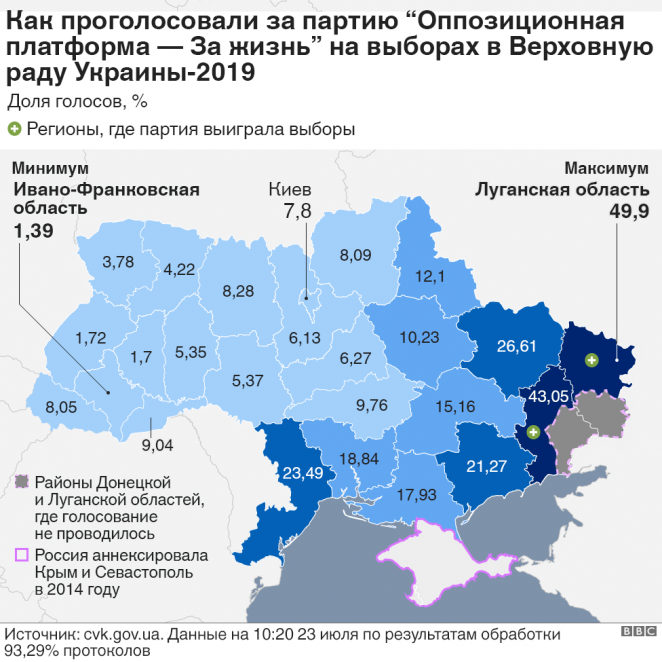 Партия, считающаяся самой пророссийской силой Украины, заняла первое место во всех округах Донецкой и Луганской областей, а также в Измаиле Одесской области. При этом максимальные результаты - 57% голосов и выше - ОПЗЖ показала в прифронтовых округах: Торецк, Новоайдар, Станица Луганская.