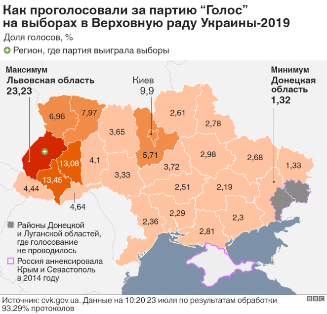 Меньше всего партия Вакарчука набрала на юго-востоке, а ее показатели в контролируемых Киевом частях Донбасса не дотянули и до 1,5%. В прифронтовых Дебальцеве, Волновахе, Новоайдаре и Станице Луганской за "Голос" проголосовали менее одного процента избирателей.