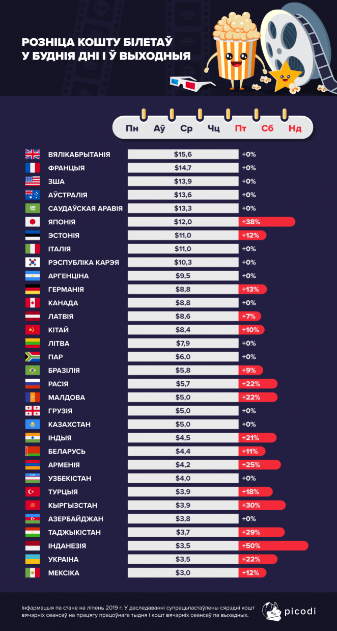 Тем не менее, в большинстве стран нет разницы в цене билетов. По крайней мере, работником отдела аналитики Picodi.com удалось найти доступные сеансы в выходные дни по цене какого-нибудь стандартного вторника.