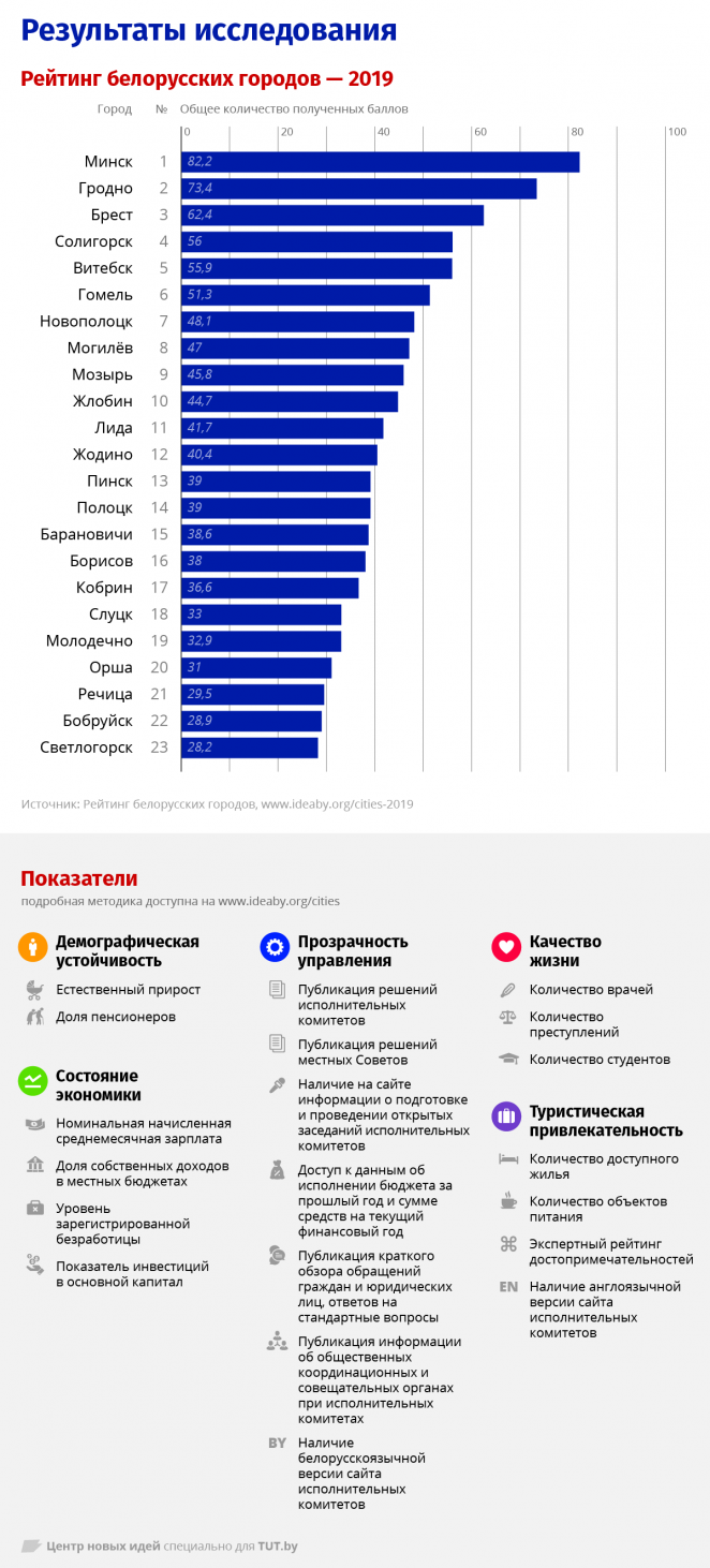 "Можно не проводить исследования, чтобы прийти к выводу, что Минск является лучшим белорусским городом: количество и качество ресурсов в столице куда выше, чем в других белорусских городах. К Минску ближе только два областных города: Гродно и Брест. Три восточных "областняка" значительно отстают, что только подтверждает идею о том, что западная часть Беларуси менее депрессивна, чем восточная.