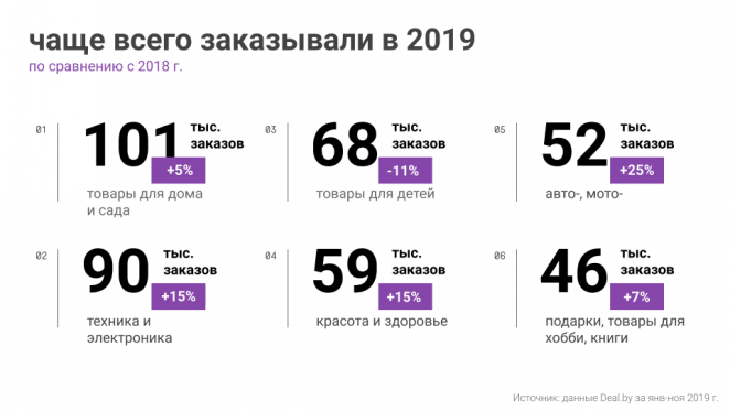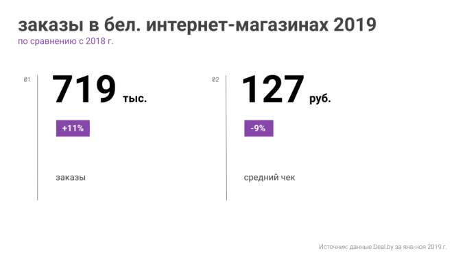 За 11 месяцев 2019 г. покупатели сделали в белорусских интернет-магазинах, размещенных на Deal.by, 719 тыс. заказов – на 11% больше, чем годом раньше. Средний чек снизился со 141 до 127 руб.