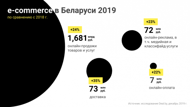 Согласно исследованию e-data.by, опубликованному в марте 2019 года, за год количество белорусов, совершающих покупки в интернете, увеличилось на 4%. В период с марта 2018-го по март 2019-го 49% или 4,7 млн жителей страны купили что-то онлайн.