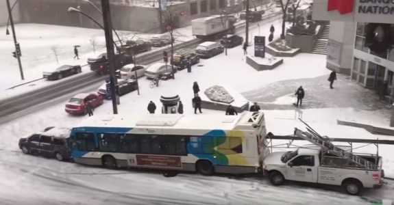Первый снег в Монреале: на перекрестке встретились два автобуса, полицейская машина и снегоуборщик