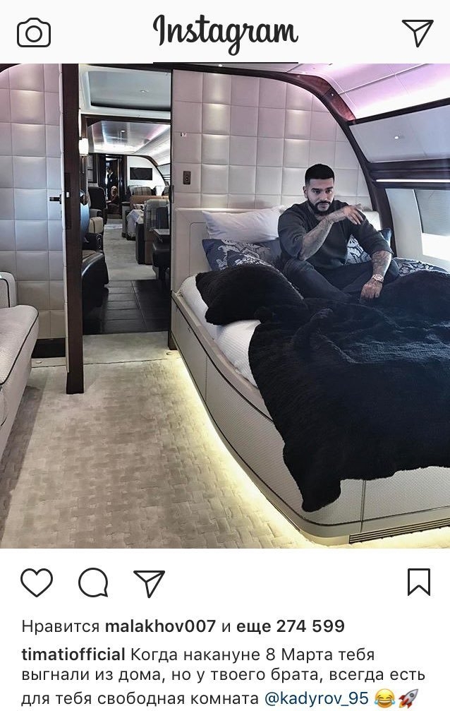 Фотография была опубликована во вторник. Тимати подписал ее словами: «Когда накануне 8 Марта тебя выгнали из дома, но у твоего брата всегда есть для тебя свободная комната». Певец сопроводил публикацию ником Кадырова, т.е. под «братом» певец подразумевает «@kadyrov_95» — аккаунт Рамзана Кадырова в Instagram.