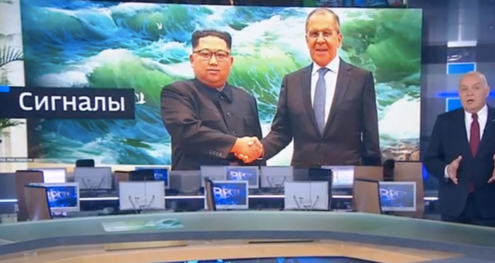 В новом выпуске «Вестей недели» на «России 1» показали сюжет о встрече главы МИД РФ Сергея Лаврова и лидера КНДР Ким Чен Ына.