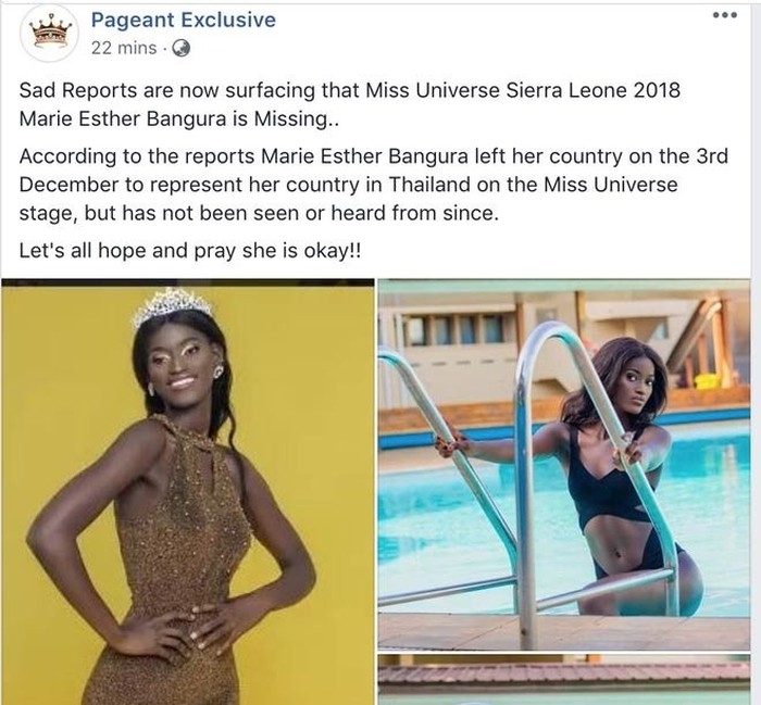 Как отмечает издание, почти все остальные участницы, кроме Эстер Бангуры, уже готовятся к мероприятию на месте. Они предпочли прилететь на самолете. Сьерралеонка должна была прибыть в Таиланд 5 декабря, но от нее до сих пор нет никаких известий.