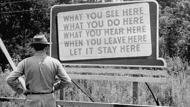 "Все, что видел здесь, что делал здесь, что слышал здесь, здесь и должно остаться!" - гласил плакат на территории, где осуществлялся проект "Манхэттен". Правообладатель иллюстрации: GETTY IMAGES
