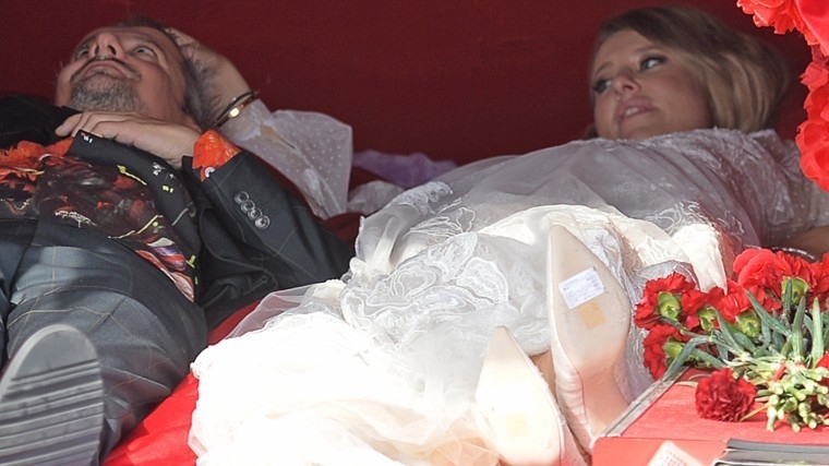 Ксения Собчак и Богомолов зарегистрировали брак в пятницу, 13 сентября. На черном катафалке, в который они приехали в ЗАГС, размещалась надпись «Пока смерть не разлучит нас». После росписи молодожены отправились в храм Вознесения Господня у Никитских ворот, где обвенчались.