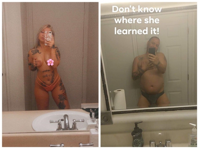 19-летняя Тара Рейли поделилась на своей страничке в "Инстаграме" пикантным селфи, на котором позировала топлес перед зеркалом в ванной. Девушка подписала, что в последнее время чувствует себя довольно уверенно. Но вышло так, что откровенный снимок попал на глаза одному из родственников, который сообщил о нём отцу Тары. Однако папа не стал ругаться на непутёвую дочь, а просто повторил её фото.