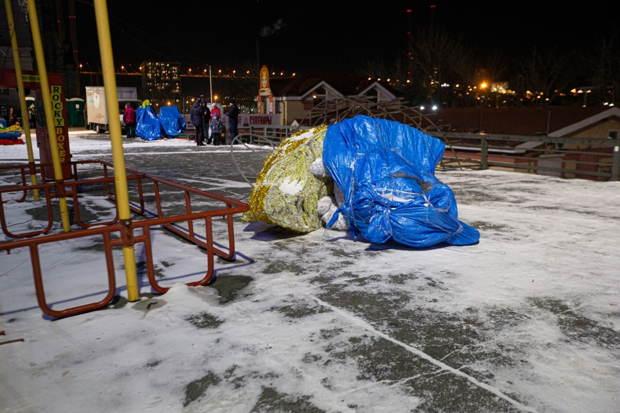 Сломанная новогодняя фигура лежала на краю центральной площади во время предновогодних народных гуляний. Еще в 22.00 31 декабря она была в своем прежнем сломанном виде.