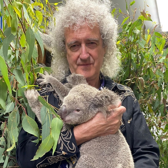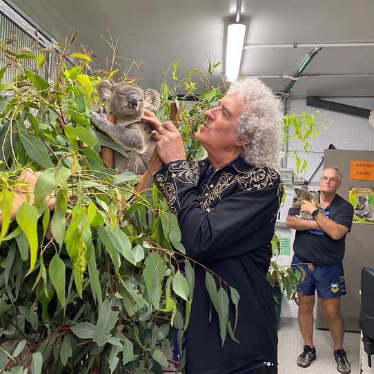 Коалу зовут Медведь, и совсем недавно её эвакуировали из горящих лесов в Австралии. Мэй встретился с животным в ветеринарной больнице Квинсленда. Судя по реакции коалы, ей нравится музыка группы Queen.