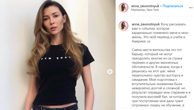 "Хочу рассказать вам о событии, которое кардинально поменяло меня и мою жизнь. Это мой переезд и учеба в Америке. Смена места жительства - это тот барьер, который не могут преодолеть многие из-за страха перемен и других жизненных обстоятельств", - пишет Заворотнюк.