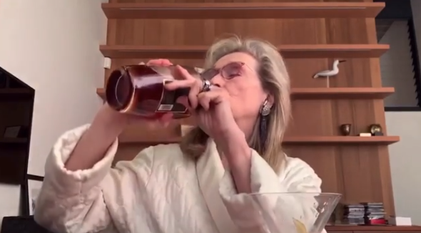 Мерил Стрип показала на видео, как смешивает себе коктейль и пьет алкоголь. Актриса, напевая одну из песен, хотела налить себе виски, а потом махнула рукой на приличия и хлебнула из горла.