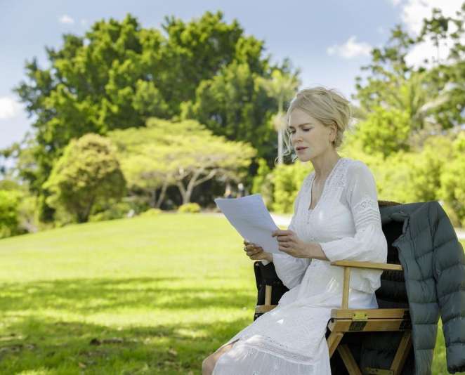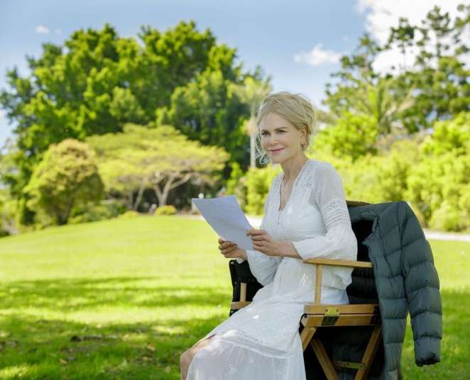 Николь позирует в трендовом летнем платье с пышными рукавами, вышивкой и оборками. Такие образы модные каждое лето, но в этом году они просто на пике популярности. Звезда собрала волосы на затылке и сделала легкий макияж. Она сидит на кресле посреди сада и изучает сценарий.