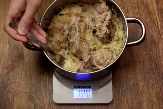 По массе получилось 1 килограмм 180 грамм, а с костями почти полтора килограмма. Так что приготовить полноценный ужин за два рубля возможно, делает выводы блогер — тушеная капуста с мясом спасет в тяжелые времена.