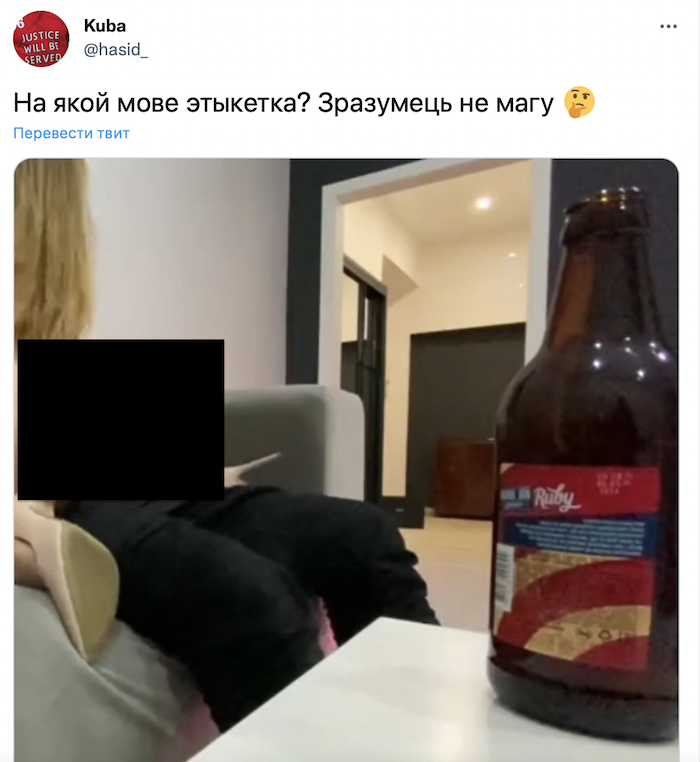 Сначала скриншот видео появился в паблике No Context Belarus. Этикетка на бутылке, стоящей на столе, показалась знакомой одному из пользователей твиттера. Он решил отыскать видео, чтобы разглядеть лучше. И действительно — в кадр попало пиво«Аліварыя» из линейки «Кароль Ян» со вкусом вишни.