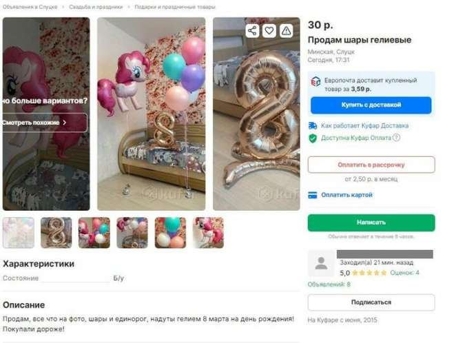 «Продам, все что на фото: шары и единорог. Надуты гелием 8 марта, на день рождения!».