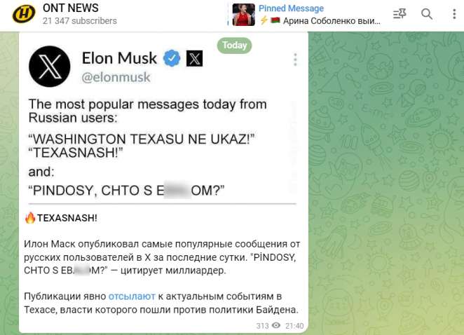 В тексте сообщения утверждается, что Маск опубликовал самые популярные сообщения в соцсети X от россиян — и среди них якобы оказались посты с фразами «Техас наш» и «Пиндосы, что с е***м?».