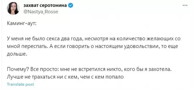 «Учитывая мою установку, что лучше никакого секса, чем средненький, его отсутствие переносится легко. Это мое сознательное решение, и мне с этим комфортно. Мне хочется секса — я не скрываю. Это даже трудно в какой-то степени, но с этим можно жить, особенно если ты понимаешь, почему это делаешь».