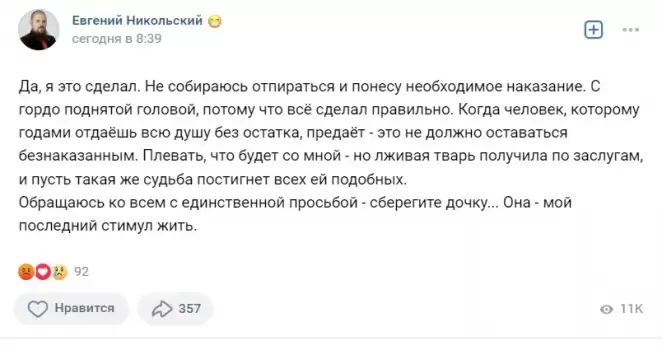 Сообщение Евгения Никольского на его странице во «Вконтакте»