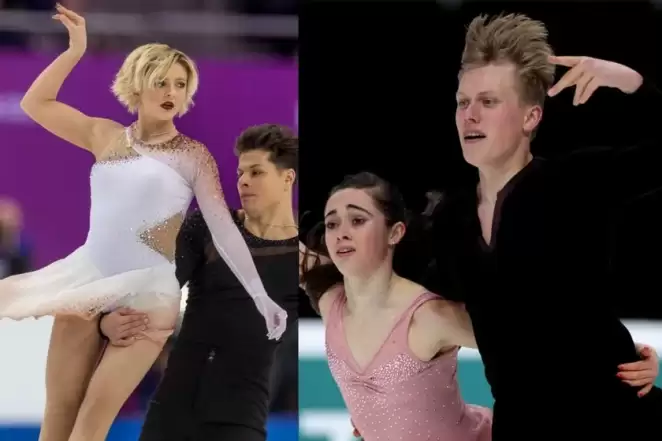 На снимке слева Солен Мазинг вместе со своим партнером Марком Евгением Гайдаенко, справа — Изабелла Флорес вместе с Иваном Десятовым. Фото: Olimpik / NurPhoto via Getty Image, Эзра шоу / Getty Images