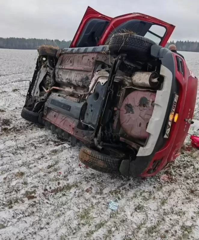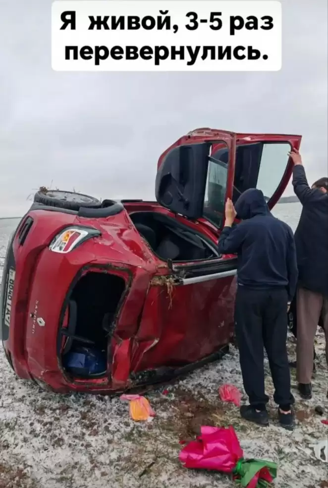 Александр Солодуха-младший опубликовал в соцсетях фото перевернутого красного Renault Sandero, рядом с которым валяется букет в розово-зеленой обертке.