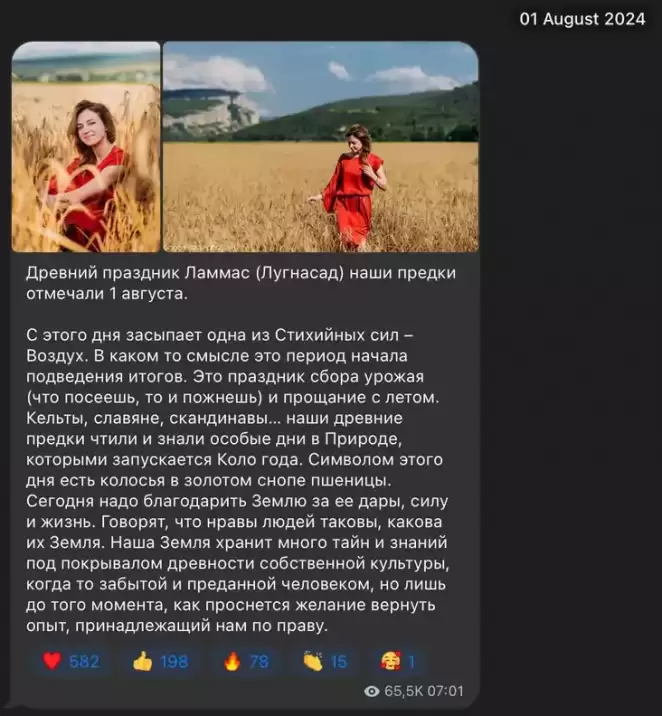 Но в середине 2024 года телеграм-канал Поклонской резко изменился. Там очень мало политики, совсем нет православия и выглядит он как канал «просветлнной гуру». Например, она поздравляла подписчиков с «древним праздником Ламмас».