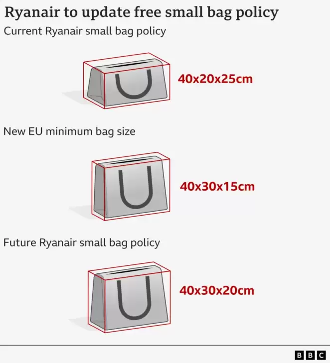 Ryanair сообщила, что новый размер бесплатной ручной клади вступит в силу в ближайшие недели, когда ее приборы для измерения размера сумки будут адаптированы к новому стандарту.
