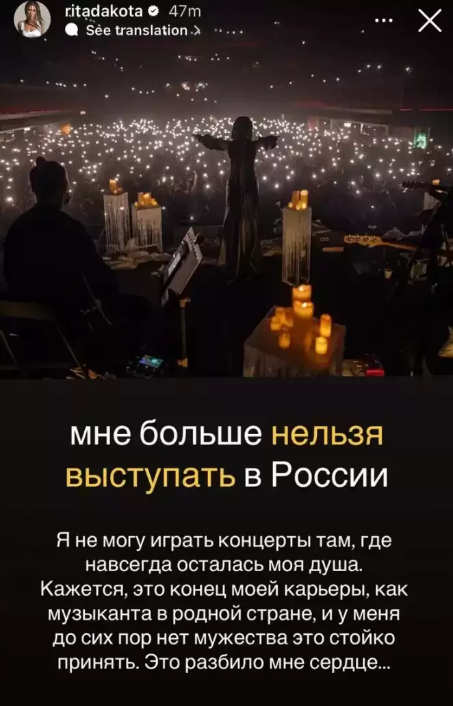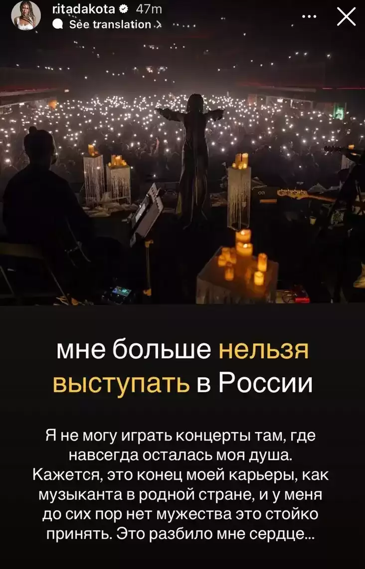 «Мне больше нельзя выступать в России. Я не могу играть концерты там, где навсегда осталась моя душа. Кажется, это конец моей карьеры как музыканта в родной стране, и у меня до сих пор нет мужества это стойко принять. Это разбило мне сердце…» — пишет певица.