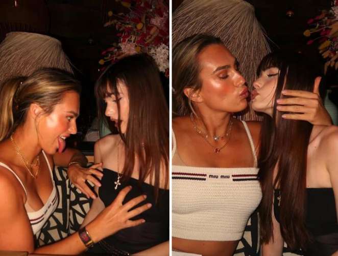 На снимках сестры Соболенко весело проводят время. На одной фотографии Арина делает вид, что собирается дотронуться руками до груди Антонины, на другой — девушки тянутся друг к другу губами, замерев в нескольких сантиметрах от поцелуя.