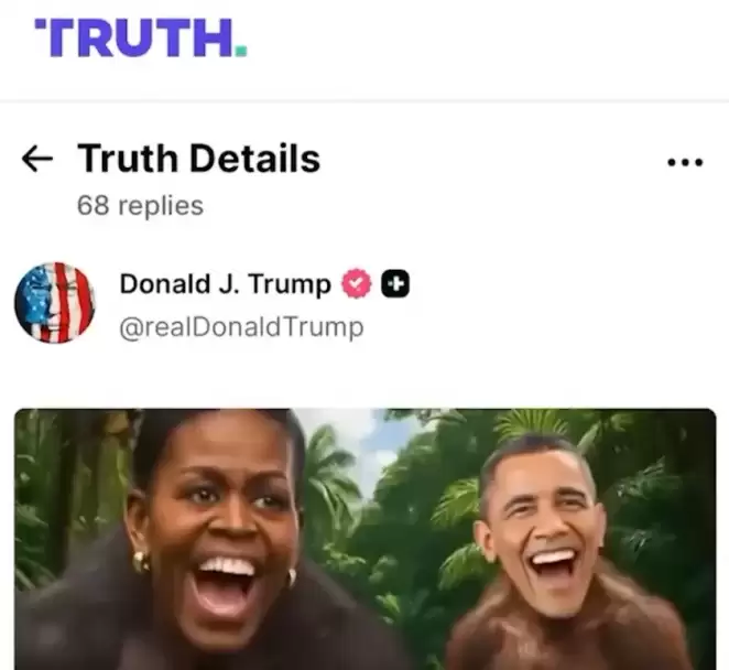 Дональд Трамп оказался в центре скандала после публикации на своей странице в Truth Social видео, на котором Барак Обама и его жена Мишель Обама показаны в виде танцующих обезьян.