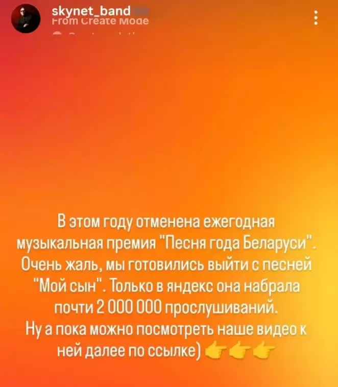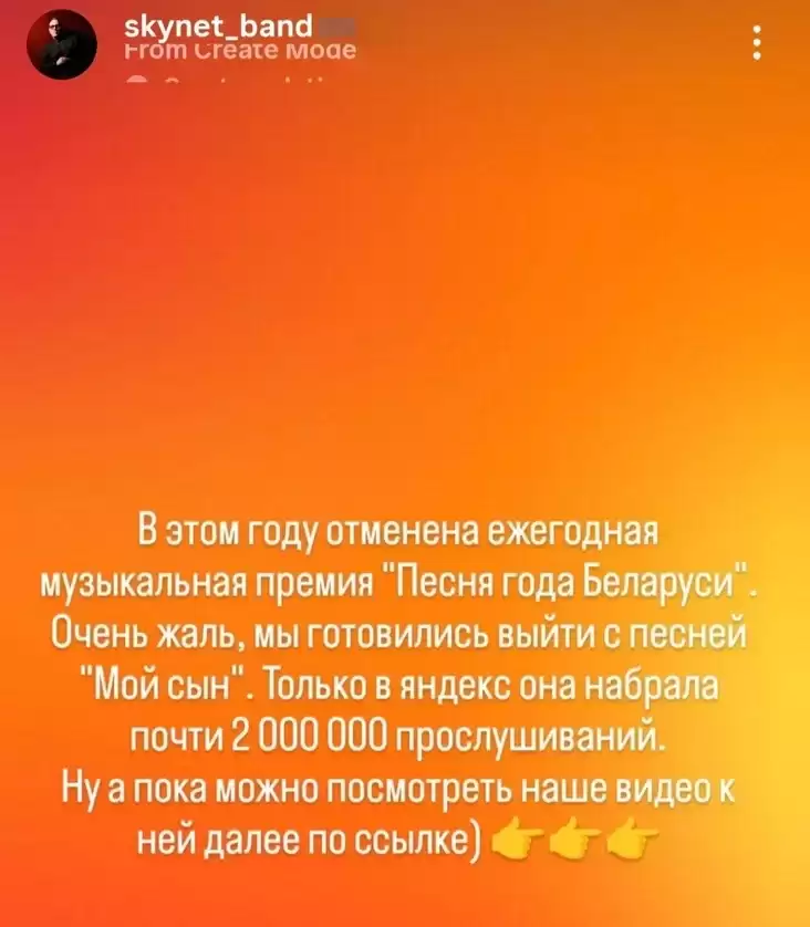На «Песне года Беларуси — 2026» рок-группа Skynet планировала петь песню «Мой сын», набравшую на «Яндекс.Музыка» 2 миллиона прослушиваний. Иван написал в сторис, что ему очень жаль, что музыкальная премия в этом году не состоится.