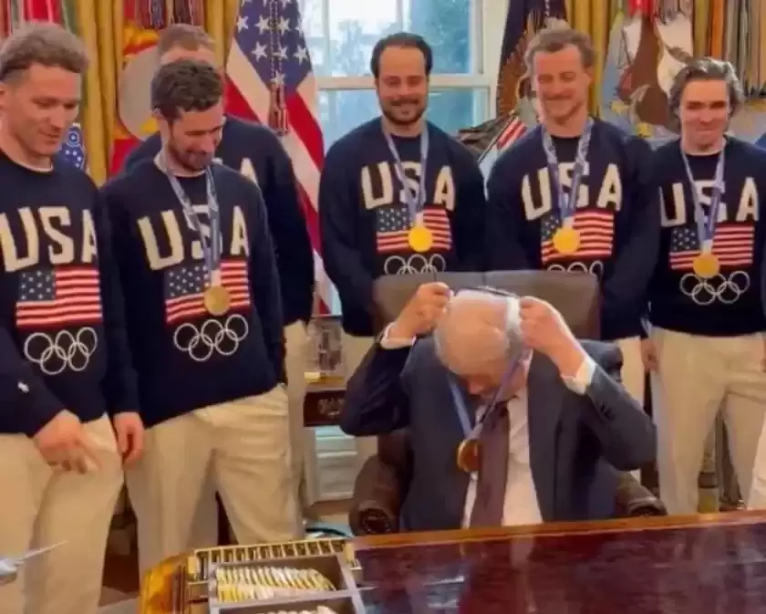 Во время торжественной встречи с чемпионами Олимпиады-2026 Трамп получил из рук форварда американской сборной Мэттью Ткачука золотую медаль и сразу повесил ее себе на шею. Осмотрев награду, глава государства с улыбкой заявил под общий смех: