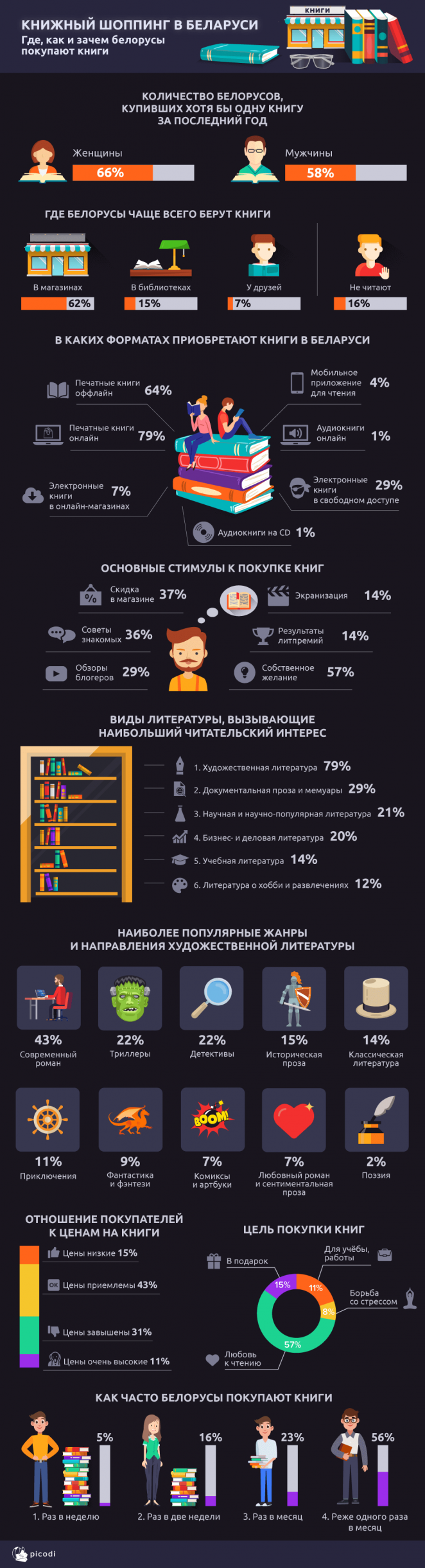 Чаще всего белорусы покупают литературу из-за любви к чтению (57%), хотя есть и те, кто всё ещё считает, что книга — лучший подарок (15%). 20% указали, что книги им нужны для работы или учёбы, а 8% с помощью книжного шоппинга борются со стрессом (неловкий вопрос «читаете ли Вы купленные книги» мы задать не решились).