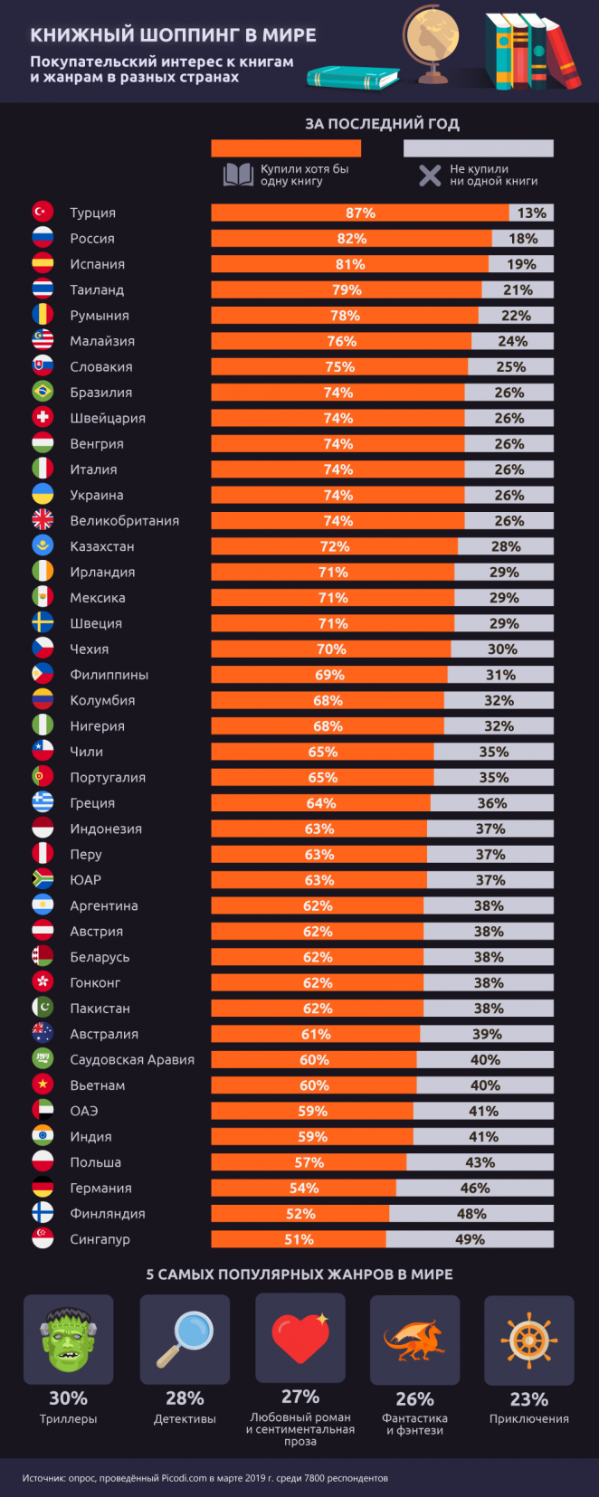 Опрос не был направлен на поиски самой читающей нации, зато Picodi.com может назвать самую щедрую на книжные расходы страну мира. В первой тройке оказались Турция, Россия и Испания. Беларусь в списке разместилась на 30-м месте.