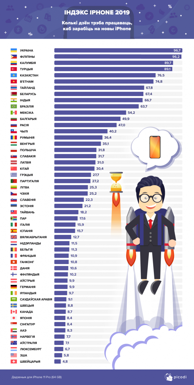 В лидерах рейтинга оказались Швейцария, США, а также Люксембург, где соотношение iPhone’a к средней заработной плате является самым выгодным. Среднестатистический швейцарец сможет накопить необходимую сумму на iPhone 11 Pro за 4,8 дня, американец – за 5,8 дня, a люксембуржец – за 6,7 дня.