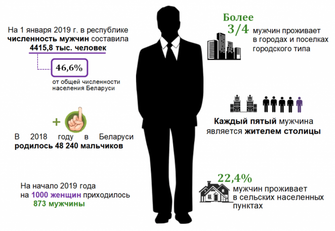 По официальной информации, на начало этого года доля мужчин в населении Беларуси составляла 46,6%. На 1000 женщин в стране приходится 873 мужчины. Три четверти мужчин проживает в городах и поселках городского типа. Каждый пятый живет в Минске. На селе живут 22,4% мужчин.