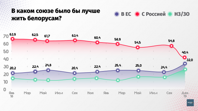 Из сведений Белорусской аналитической мастерской следует, что в течение 2019 года в белорусском обществе произошла смена геополитической ориентации. Процент сторонников союза с Россией снизился с 60,4 до 40,4%. Таким образом, если завтра состоится референдум по поводу геополитического выбора Беларуси, то сторонники союза с Россией не смогут получить абсолютного большинства голосов.