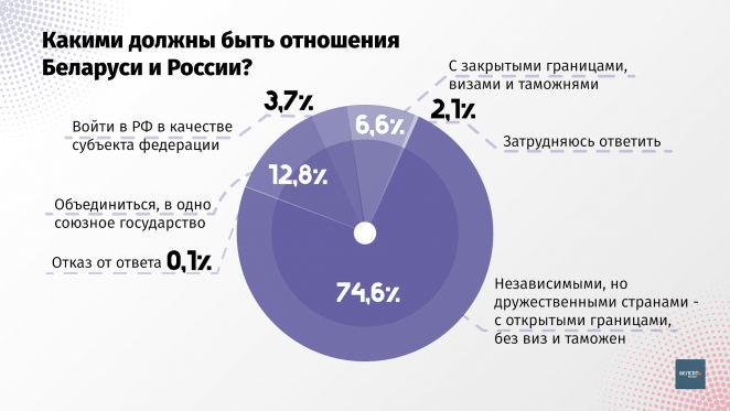 Абсолютное большинство белорусов – 74,6% – убеждены, что Беларусь и Россия должны быть полностью независимыми государствами, но иметь дружеские отношения с открытой границей, отсутствием виз и таможни. А вот 6,6% опрошенных считают, что отношения с Россией не должны отличаться от отношений с другими странами, – то есть, должны существовать закрытая граница, таможня и визы.