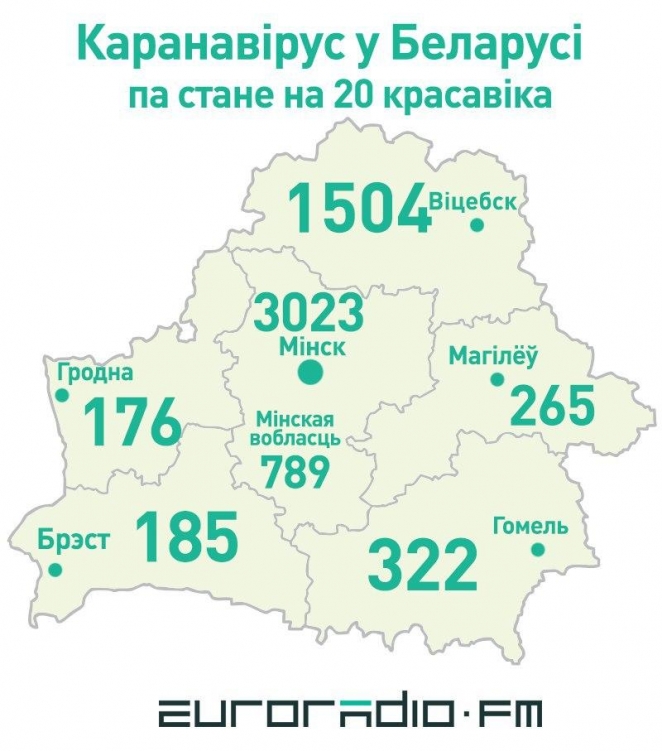 Ситуация по регионам следующая: в Минске — 3023 случая COVID-19, в Витебской области — 1504, в Минской — 789, в Гомельской — 322, в Могилевской — 265, в Брестской — 185, в Гродненской области — 176. "В особом внимании специалистов" нуждаются 92 человека — они имеют тяжелые заболевания. Выздоровели и выписаны из больниц 514 человек. На сегодняшний день в Беларуси умер 51 человек.