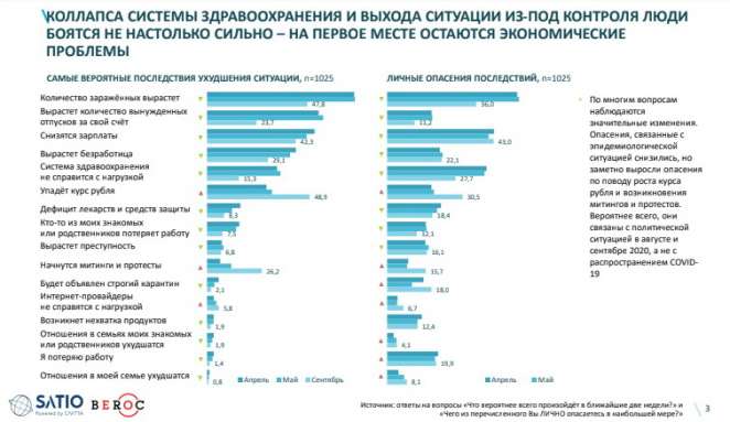 Данные сентябрьского опроса очень похожи на результаты, полученные в ходе майского исследования. В сентябре опасения белорусов, связанные с эпидемиологической ситуацией уменьшились. Однако заметно выросли опасения по поводу снижения курса рубля и возникновения митингов и протестов.