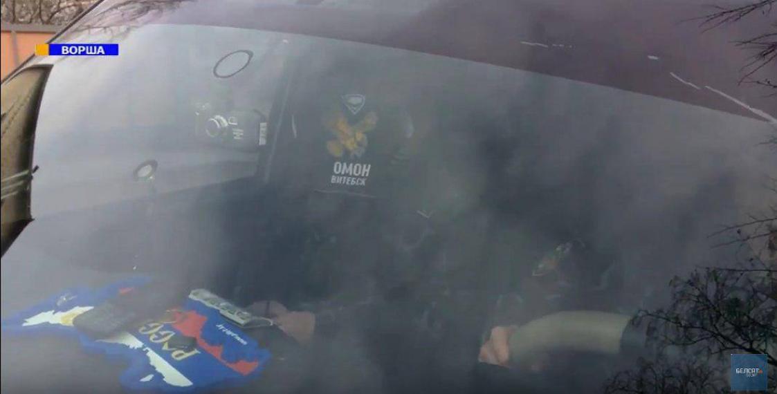 Но в итоге милицейское авто оказалось заснятым со всех сторон. Блогеры, которые наблюдали за трансляцией, "нашли" на его приборной панели карту России, раскрашеннуюе в цвета флага РФ, а также брелок в форме ладони с российским гербом и триколором. Все это соседствовало с символом витебского ОМОНа, прикрепленным к лобовому стеклу.