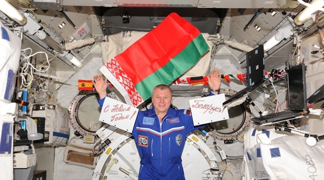 Вот так Олег Новицкий поздравлял Беларусь с Новым годом. Даже в Космосе флаг умудрились повесить вверх ногами, пишет "Белорусский партизан".